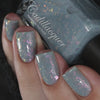 You Don't Feel The Air Flexing? is from the new Halloween 2024 Collection by Cadillacquer. You Don't Feel The Air Flexing? is a light bluish grey nail polish, packed with bigger pink/orange/yellow iridescent flakes.