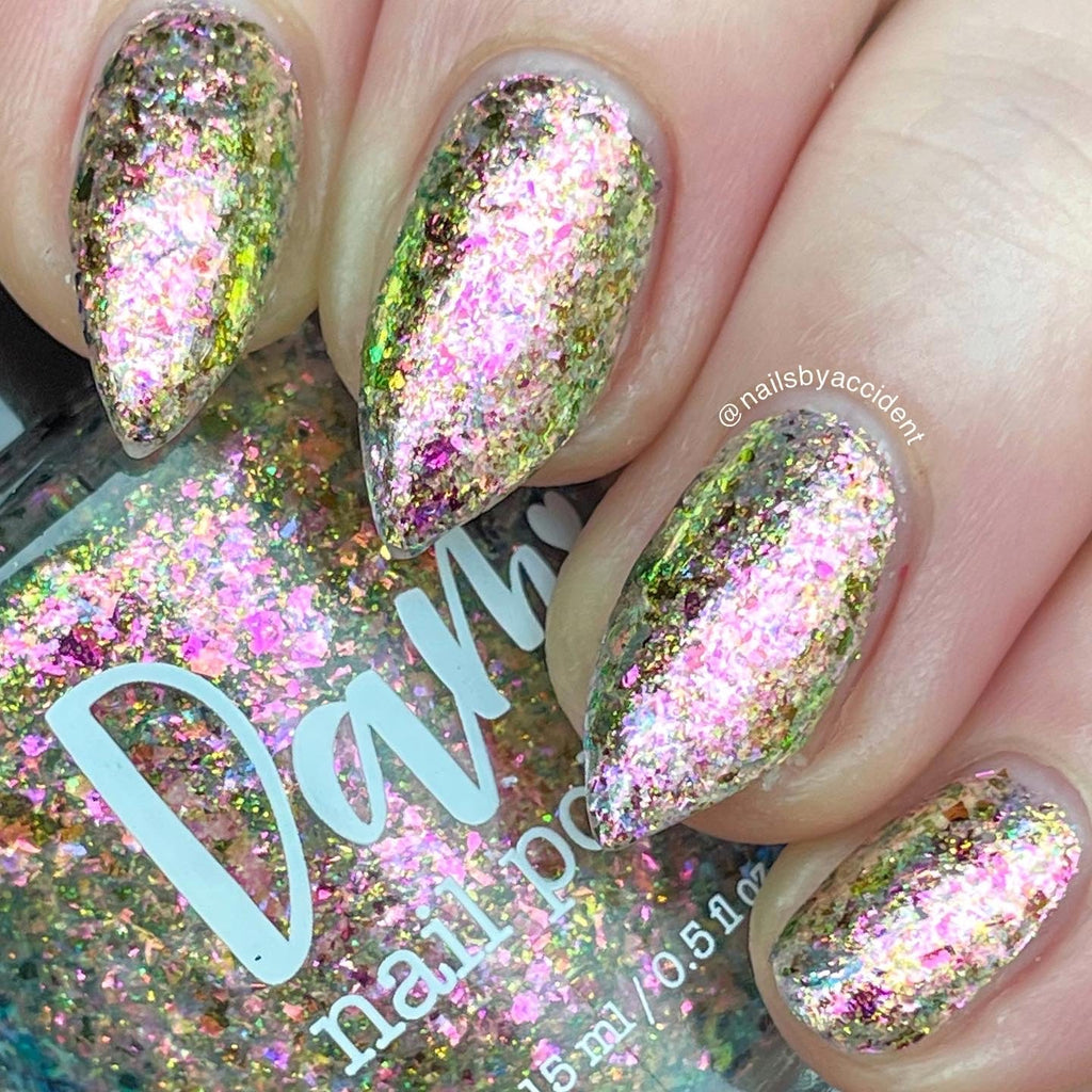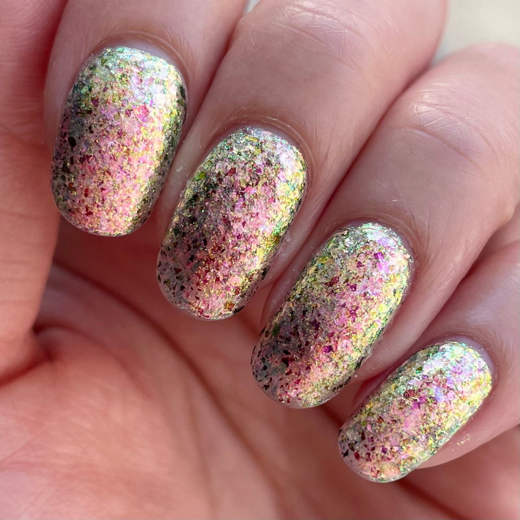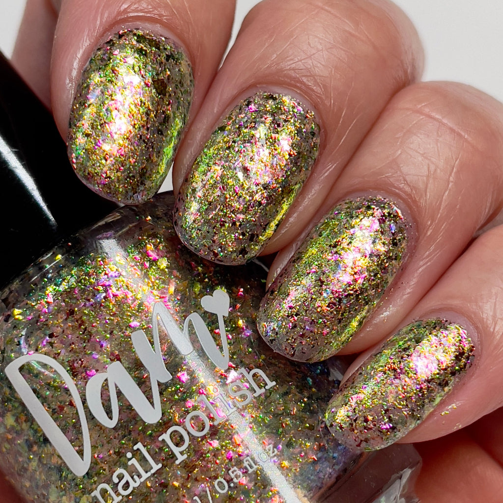 Ayla the Scoliosis Dolphin by Dam Nail Polish is a flakie polish with flakes of gold, pink, green and blue to green shifting shimmer.