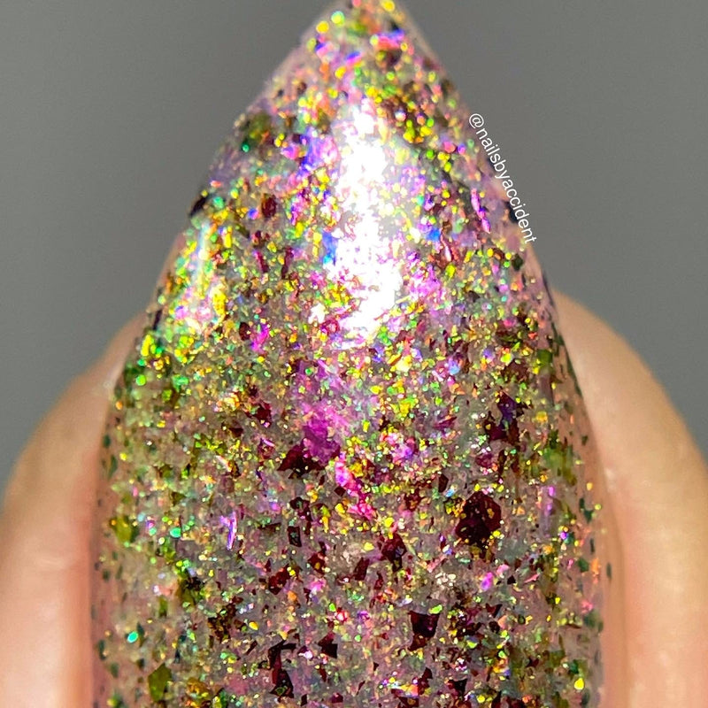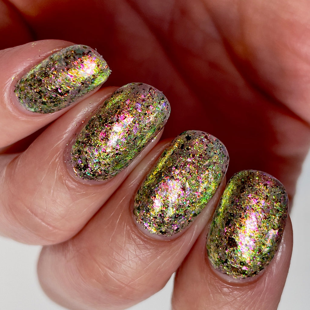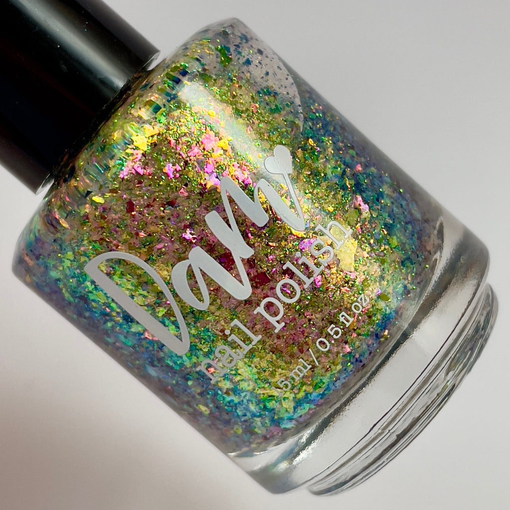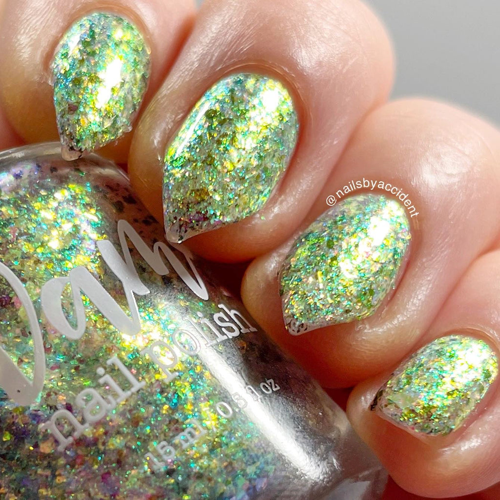 Ayla the Scoliosis Dolphin by Dam Nail Polish is a flakie polish with flakes of gold, pink, green and blue to green shifting shimmer.