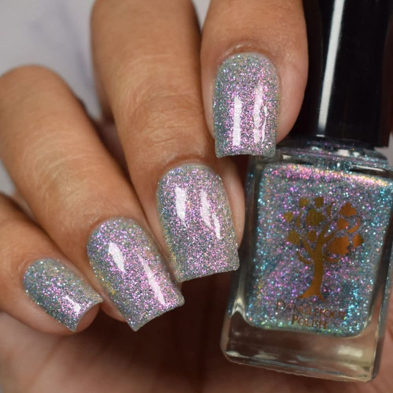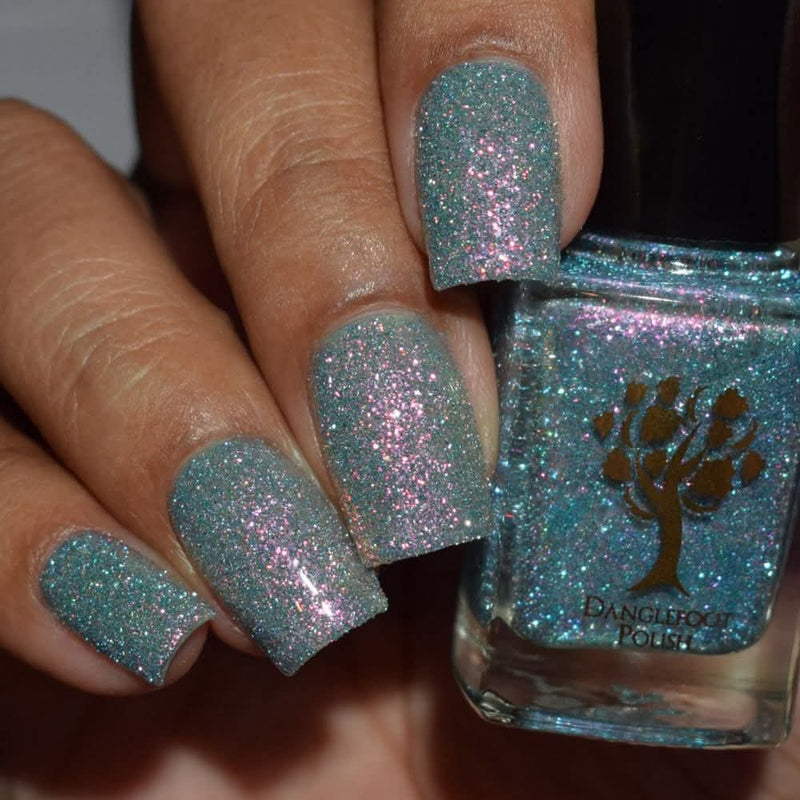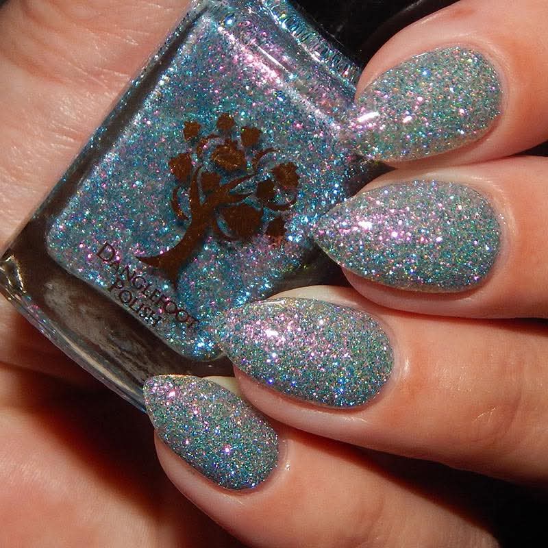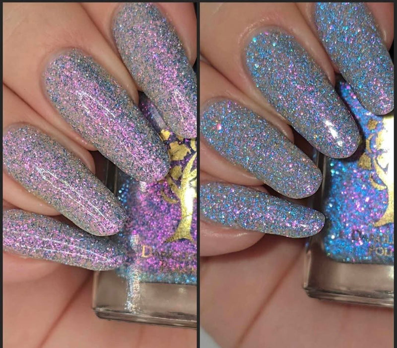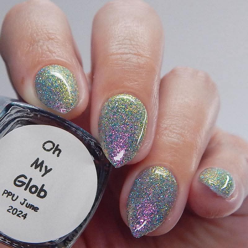 For Polish Pickup Rewind 2025, Danglefoot Polish is bringing back Oh my Glob, a pink/yellow colour shifting shimmer with light blue reflective glitter flakes with a slight grey/blue base.