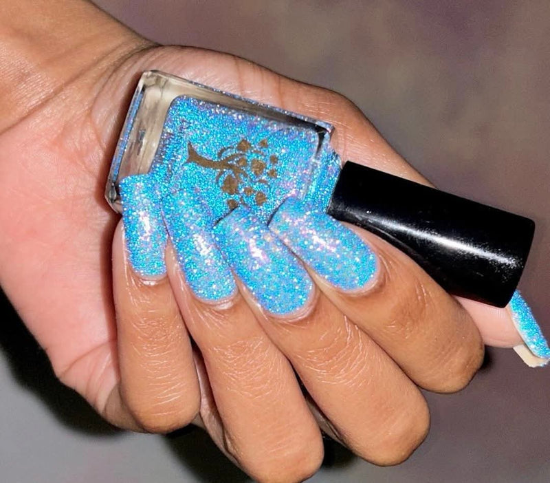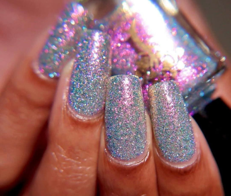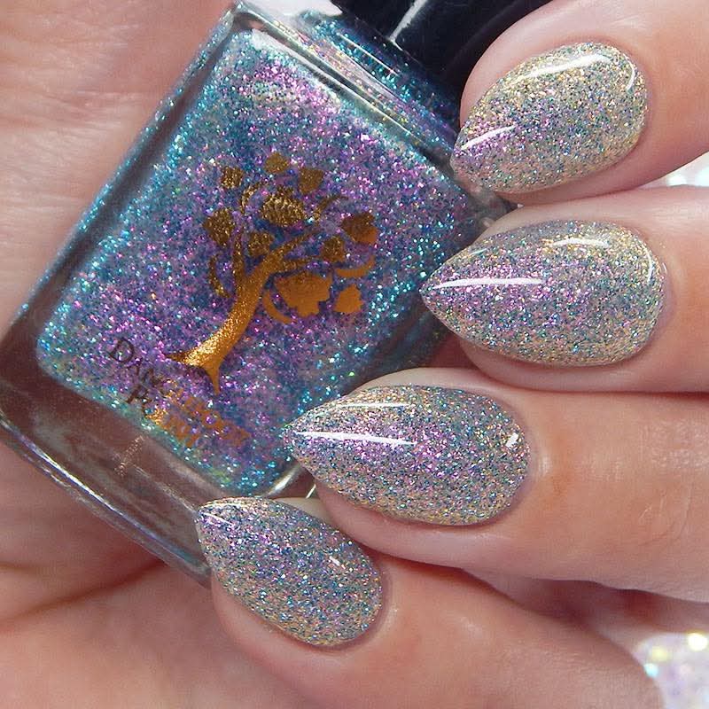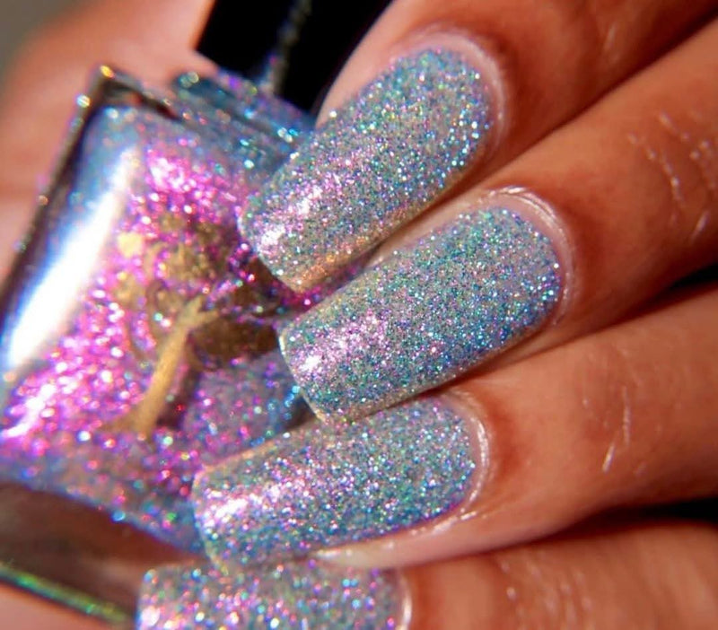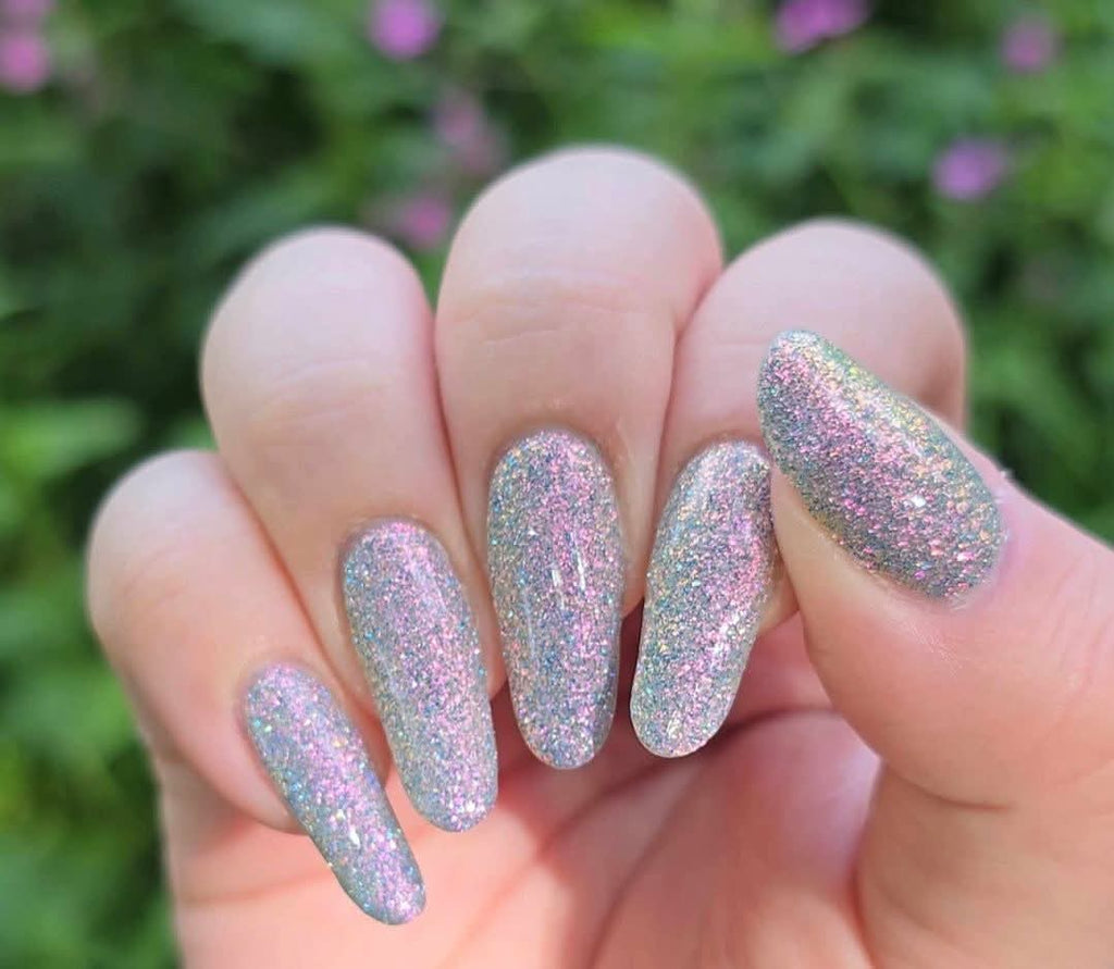 For Polish Pickup Rewind 2025, Danglefoot Polish is bringing back Oh my Glob, a pink/yellow colour shifting shimmer with light blue reflective glitter flakes with a slight grey/blue base.