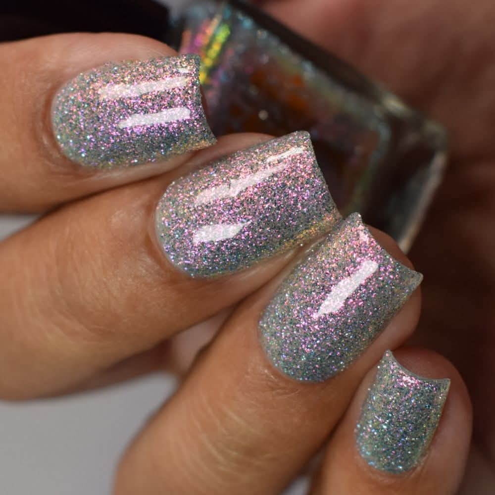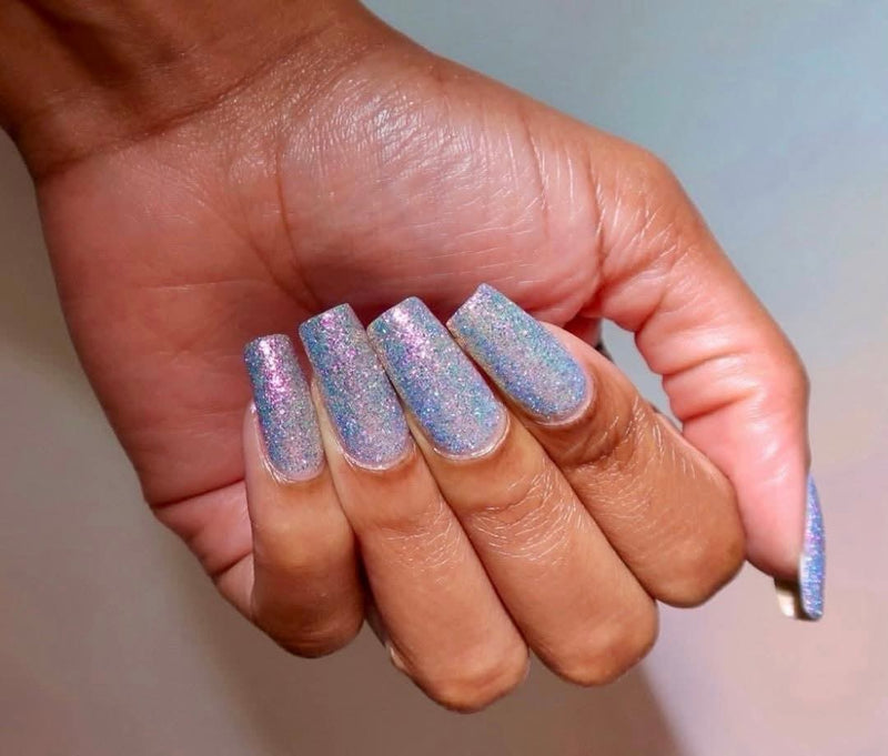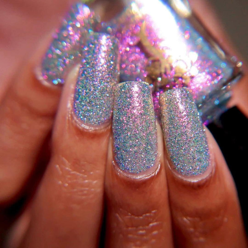 Opaque in 2 coats, glitter smoothing topcoat recommended for a smooth texture under topcoat.
